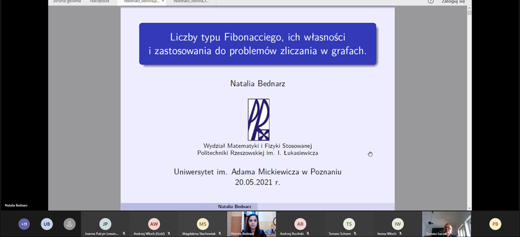 W dniu 20 maja 2021 r. na Wydziale Matematyki i Informatyki Uniwersytetu Adama Mickiewicza w Poznaniu odbyła się publiczna obrona rozprawy doktorskiej mgr Natalii Bednarz, która jest pracownikiem Zakładu Matematyki Dyskretnej. Obrona odbyła się zdalnie przy użyciu środków komunikacji elektronicznej (platforma Microsoft Teams). Komisja doktorska jednomyślnie przyjęła rozprawę pod tytułem: Liczby typu Fibonacciego, ich własności i zastosowania do problemów zliczania w grafach.